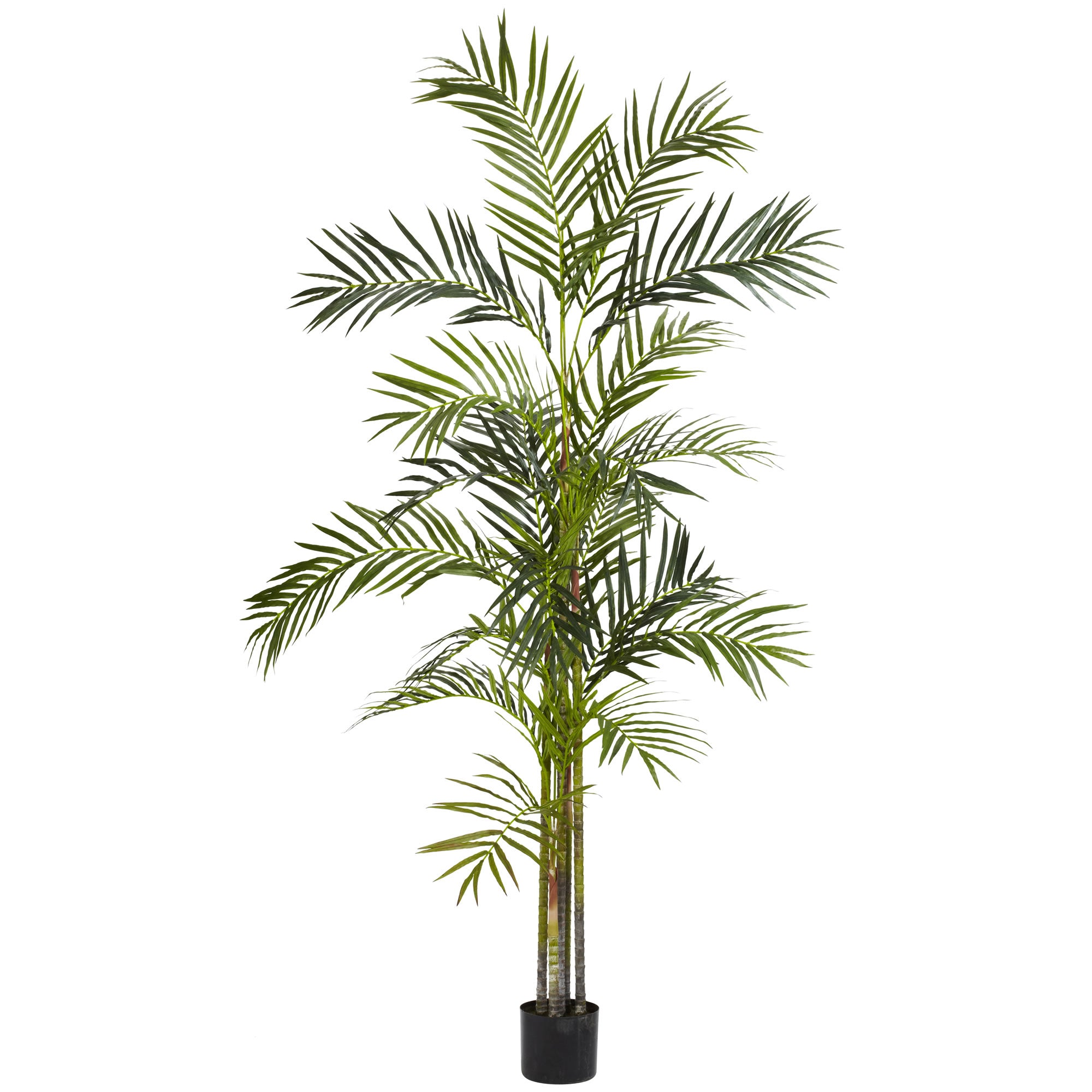 A five-trunk, 6-Foot tall Areca Palm Tree comes together to form a multi-level cascade of vibrant green leaves overflowing downward in a shower of greenery. The 580 long narrow leaves form thousands of interesting patterns as you admire the arrangement from all directions. You can also admire the fact you’ll never need to water or maintain it - ever. Comes in a pot with faux soil.